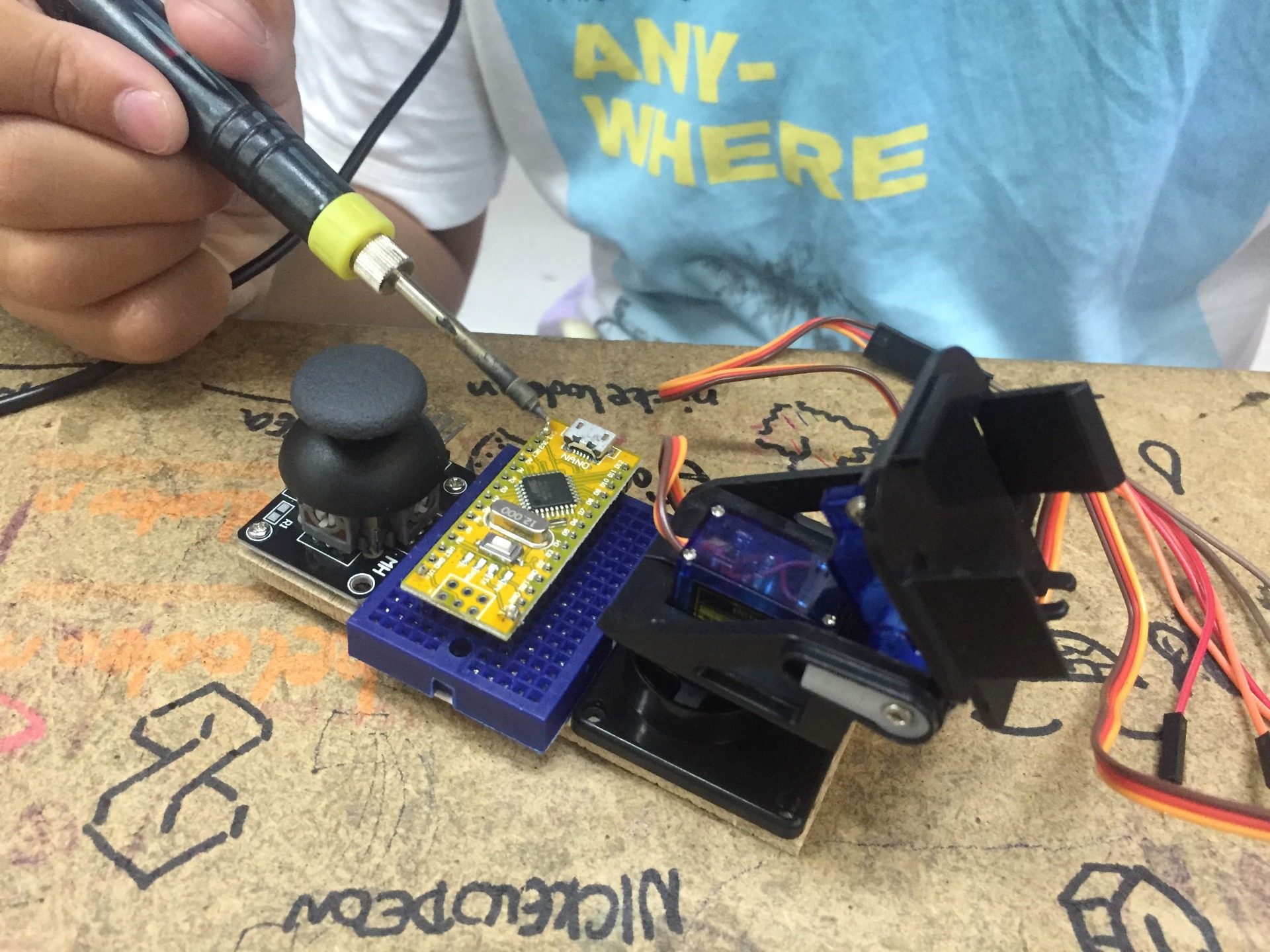 Izradi i programiraj robotsku ruku s laserom i prijemnikom te gađaj druge robotske ruke u razredu