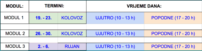 Vi birate željeni JUTARNJI ILI POPODNEVNI JEDAN TERMIN PO MODULU.